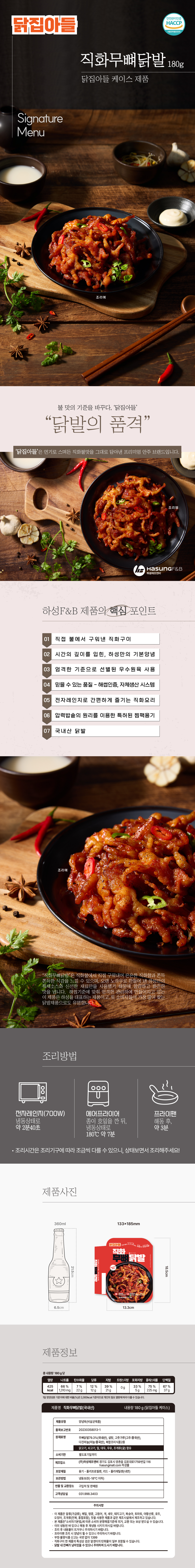 “직화무뼈닭발”은 수제직화로 구워내어 은은한 직화향과 쫀득쫀득한 식감을 느낄 수 있으며, 오랜 노하우로 만들어 낸 하성만의 특제소스와 신선한 재료만을 사용했기 때문에 깔끔하고 화끈한 맛을 냅니다.